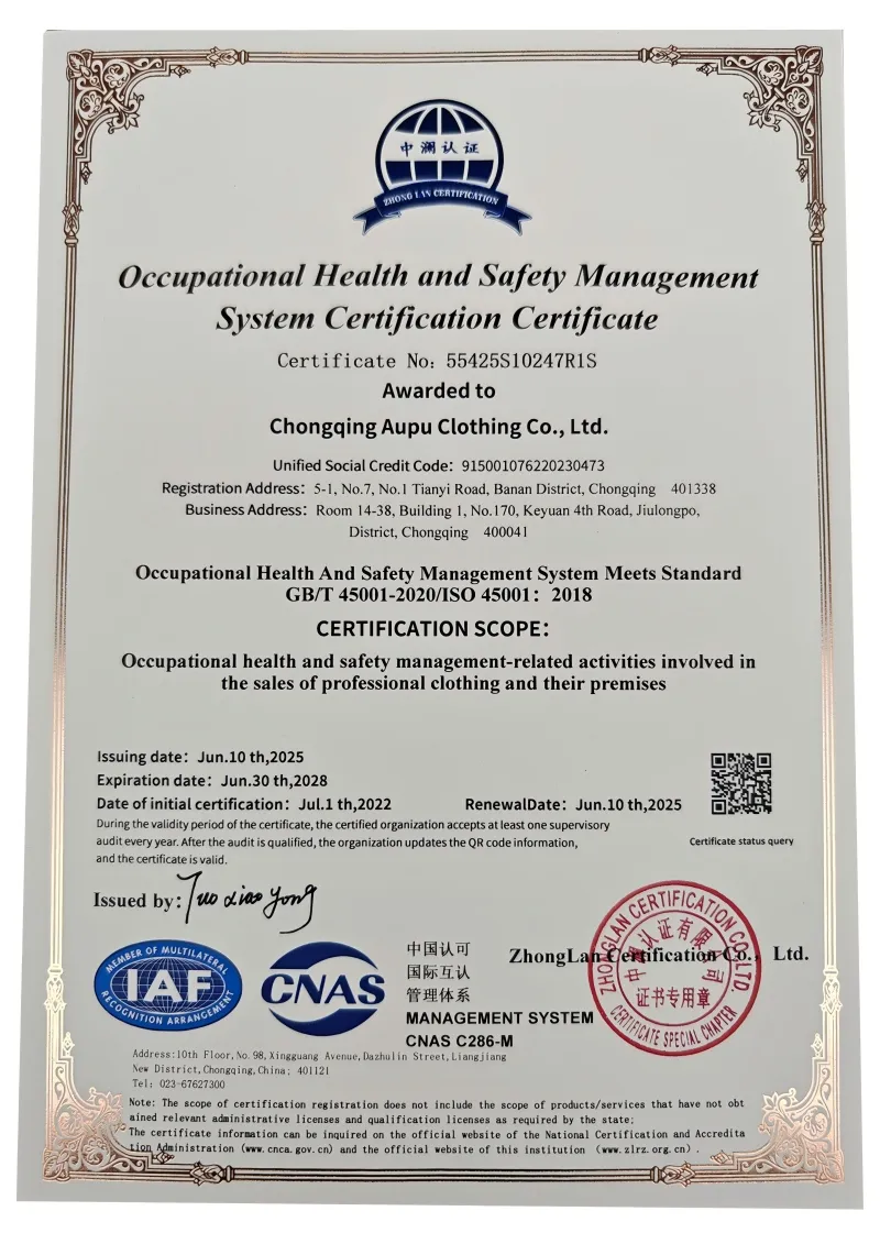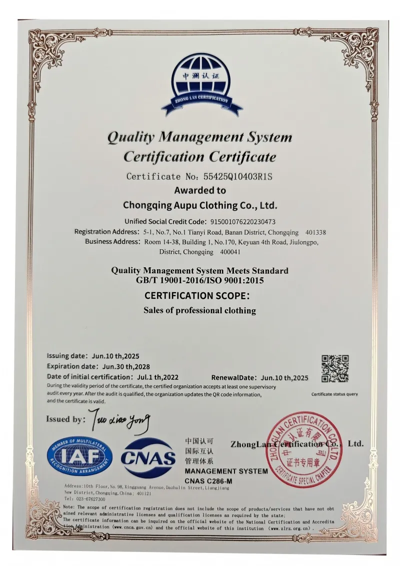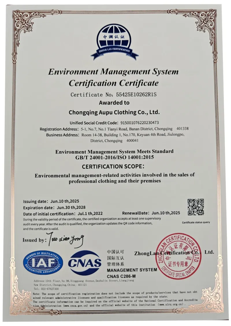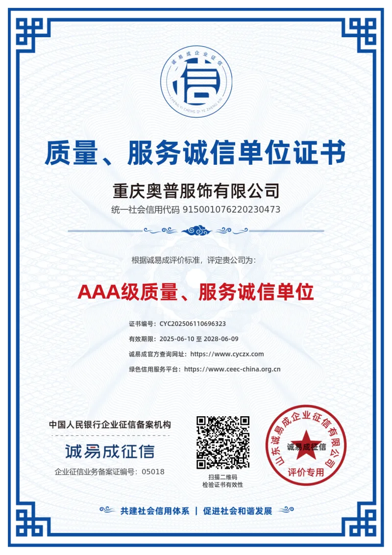 ООО Чунцин Аопу Одежда и Аксессуары была основана 20 марта 1998 года. На протяжении 28 лет компания специализируется в сфере профессиональной форменной одежды, придерживаясь принципов «строгость, ответственность и смелое стремление к прогрессу». Благодаря практичному подходу, она выросла от регионального поставщика до эксперта по индивидуальному пошиву униформы, охватывающего множество отраслей.